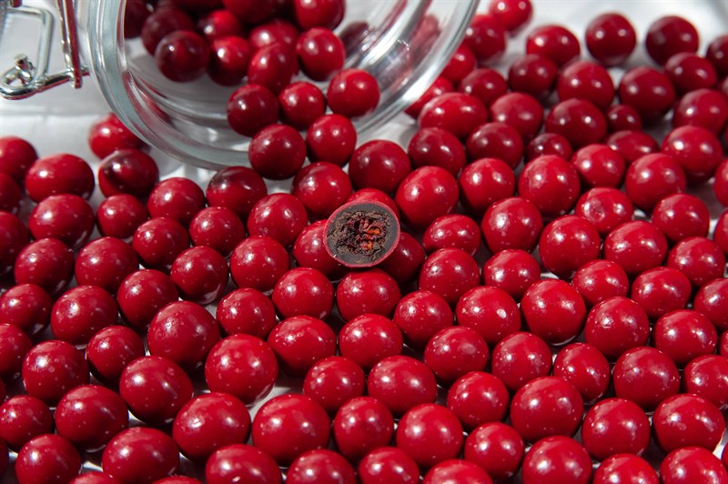 Продукт изготовлен по нашей собственной технологии. Применены натуральная вяленая ягода, тёмная глазурь и глазурь в цвет плода. В составе глазури не менее 45% какао и какао-продуктов, благодаря чему она имеет четкий вкус шоколада и не оставляет на зубах неприятную жировую плёнку.